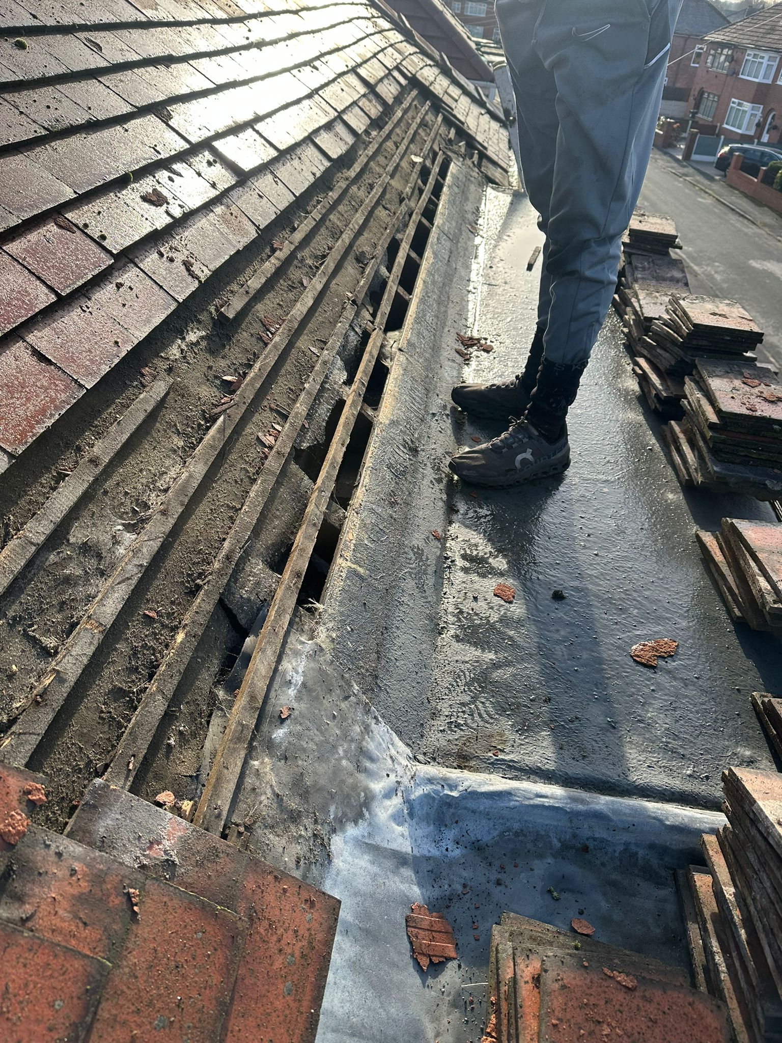 Apex Roofing specialises in fast, professional water leak repairs to bay windows, identifying the exact cause of the leak and fixing it properly. Whether it’s failed lead flashing, cracked tiles above the bay, damaged felt, poor sealing, or weather-worn brickwork, our team carry out long-lasting repairs that stop water penetration for good. We provide trusted roof leak repairs across Warrington, protecting your home from damp patches, mould, stained ceilings, and further structural damage.